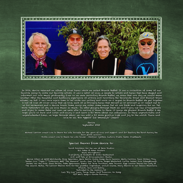 Brunch Buffet 2 - "Brunch Buffet 2 - Tasty Covers" is a sequel to our fan favorite "Brunch Buffet - Tasty Covers". Although they share similar graphics, the new album is in full California Color! On BB2 we decided to make a little bigger sounding album, using bigger drum sounds, more electric guitars and lots of original vocal and bass tracks were used from the initial track recordings. Using Shure SM58 stage microphones and singing with the speakers on and in the comfort of Michael's back patio studio, it added a unique charm and live attitude we captured with the vocals and many of Mark Harris's bass tracks are one take beauties! We started with a list of 30+ songs that we all brought to Michael's back patio studio where we played through the list and eventually narrowed it down to 10 songs. We ended up choosing the songs that we could create unique grooves or approaches to while still honoring these awesome tunes, but adding our Venice seasoning to make them our own. Brunch Buffet 2 is an awesome follow up to Brunch Buffet and can't wait for you to get your copy. Available in Vinyl and CD....and of course available on ALL streaming platforms. Enjoy!
